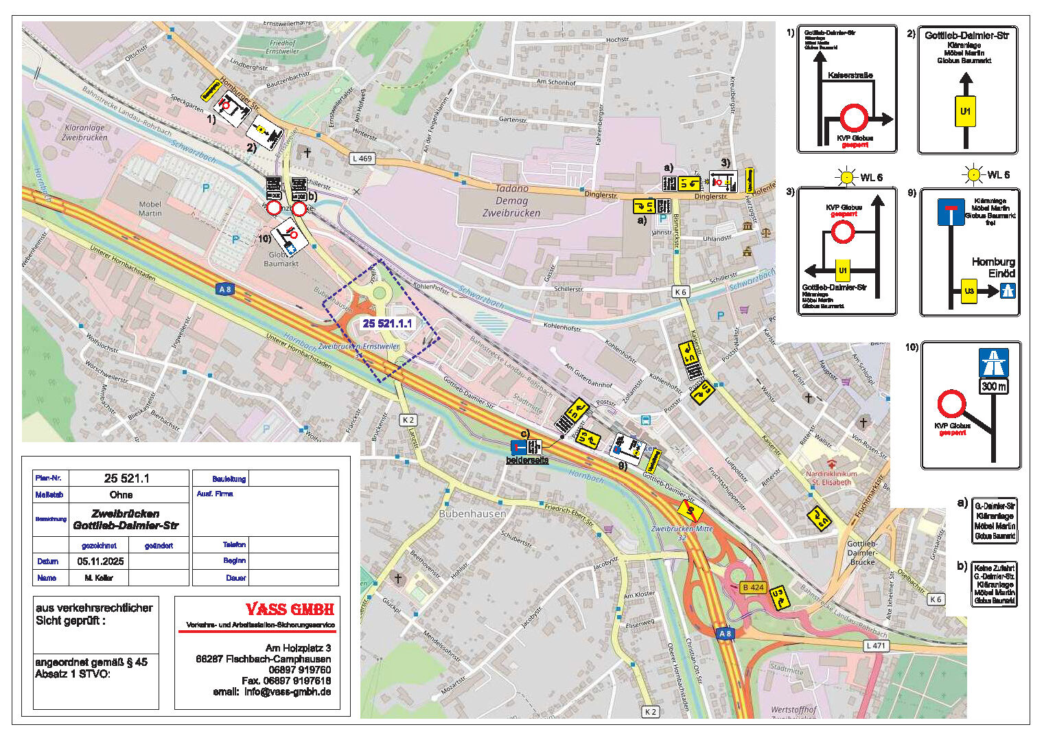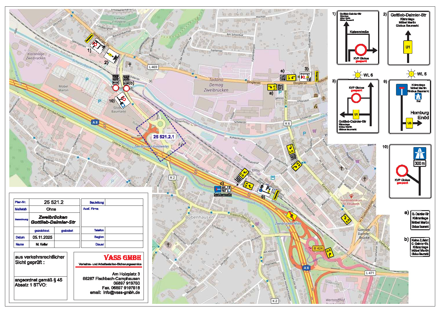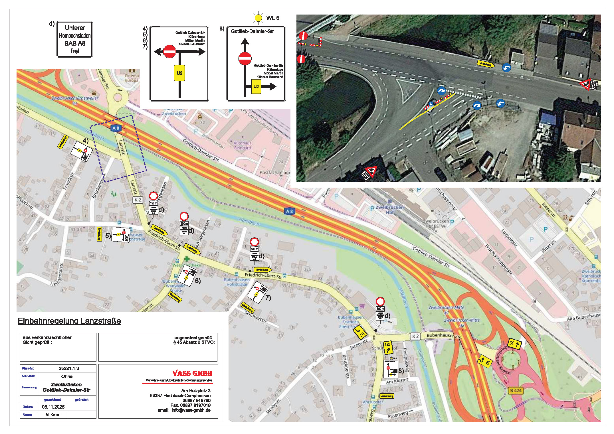Die Autobahnabfahrt Zweibrücken-Ernstweiler der A8 aus Richtung Pirmasens muss im Zuge der Arbeiten gesperrt werden. Eine ausgeschilderte Umleitung ist eingerichtet. Je nach Ziel führt die Umleitung über die Kaiserstraße und die Gottlieb‑Daimler‑Straße oder alternativ über die Friedrich‑Ebert‑Straße.