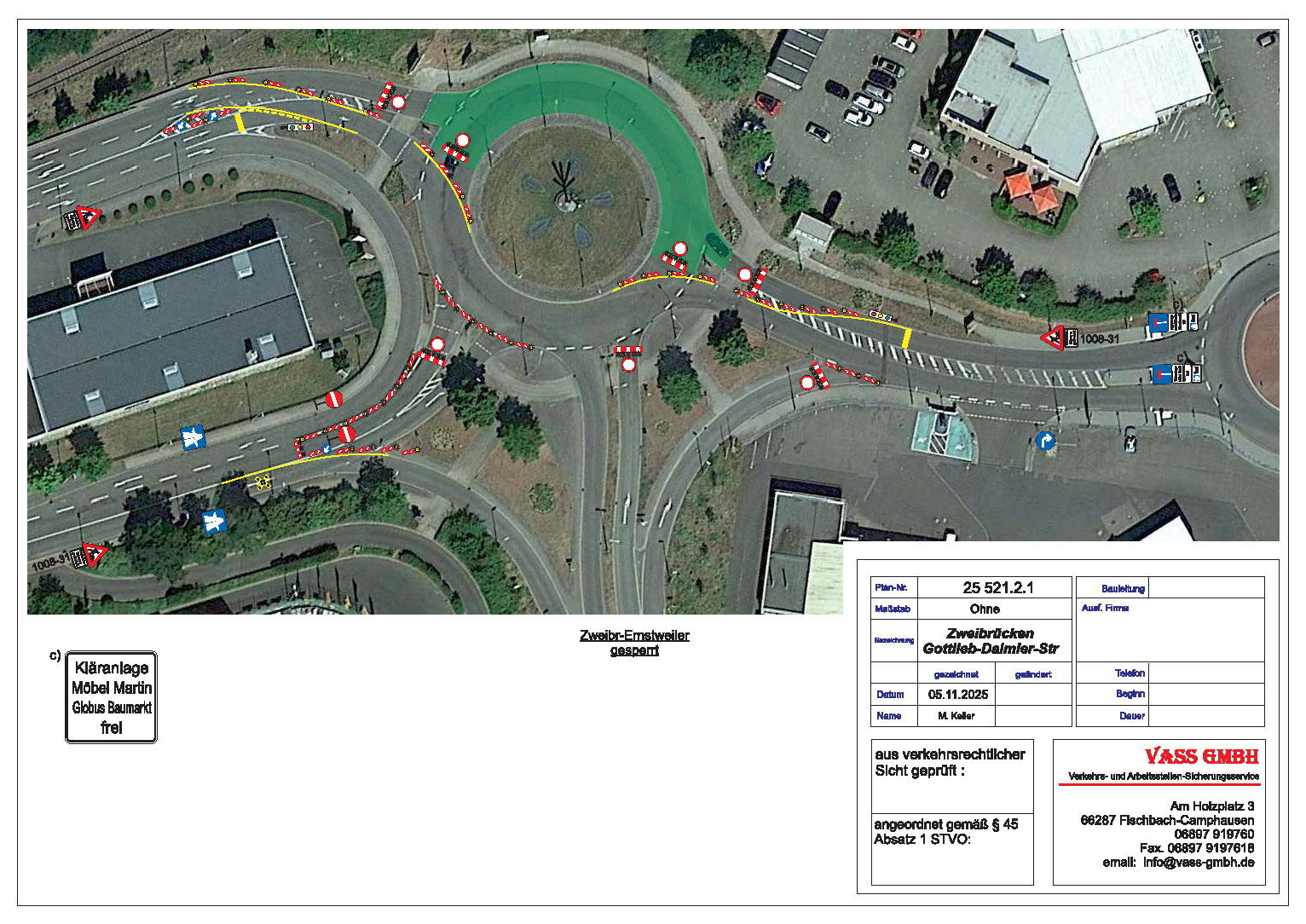 Ab Montag, 24. November 2025, beginnen am Baumarkt-Kreisel in Zweibrücken Asphaltarbeiten. Die Maßnahme läuft in zwei aufeinanderfolgenden Bauabschnitten und dauert voraussichtlich jeweils etwa eine Woche pro Abschnitt. Je Bauabschnitt wird eine Kreiselhälfte gesperrt; so bleiben die Arbeiten abschnittsweise und die Verkehrsbeeinträchtigungen so gering wie möglich.